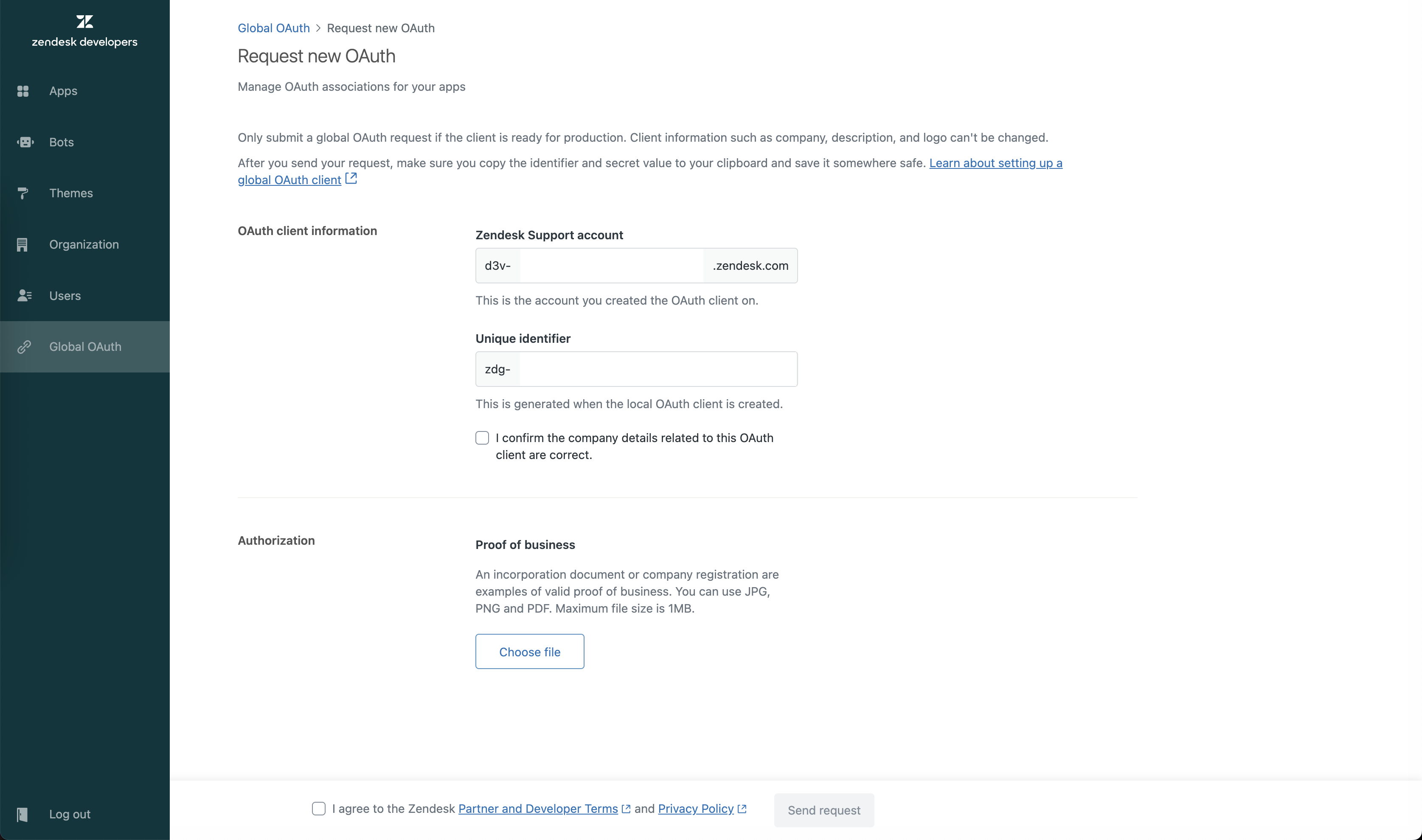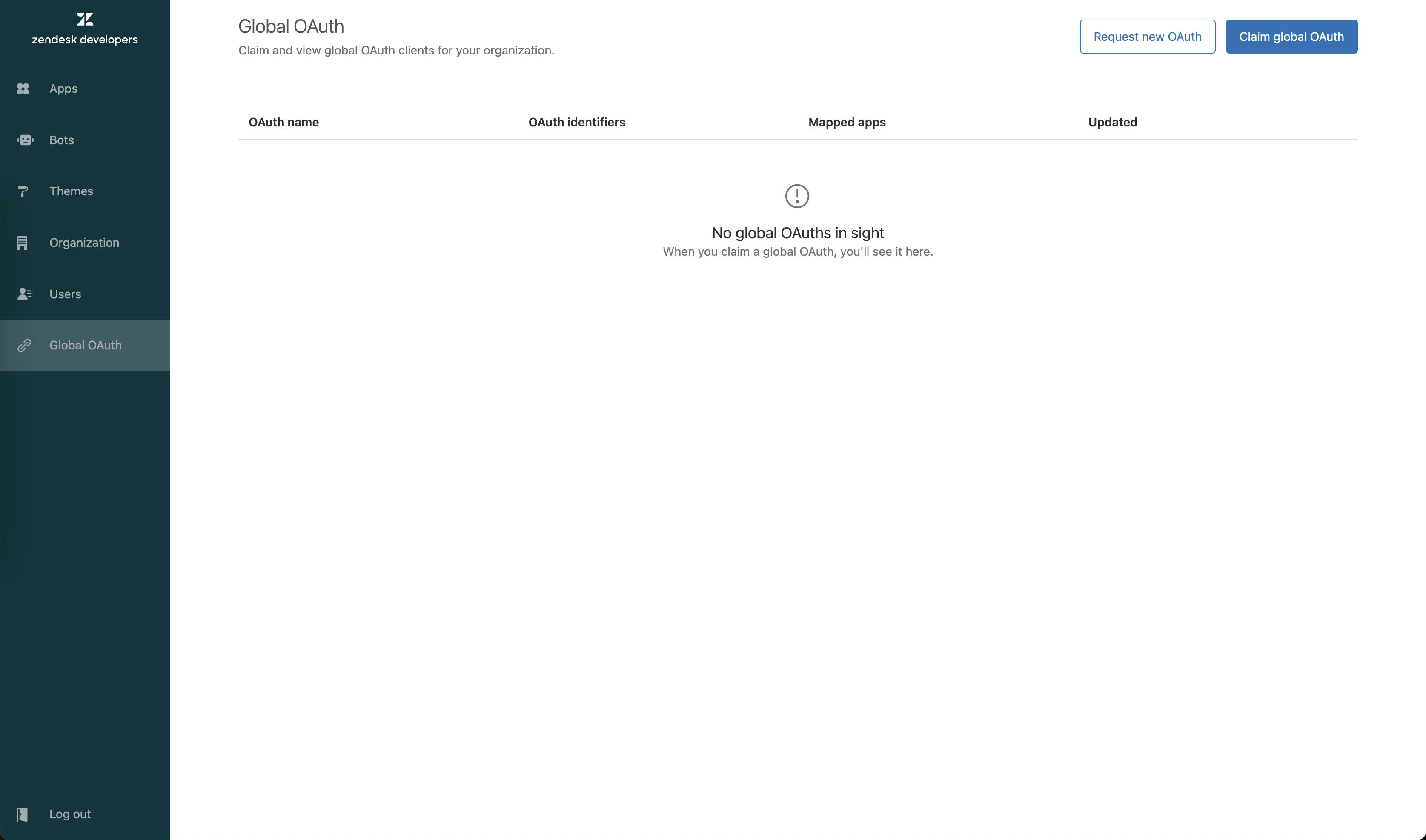 Sign in to the Zendesk Marketplace portal. Select Global OAuth from the menu on the left side, and then click the Request new OAuth button.