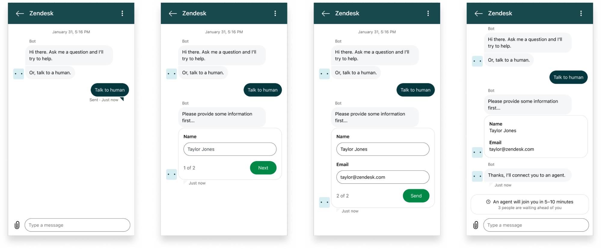 In Zendesk messaging, most messages are generated automatically as actions are taken by an end user, agent or AI agent. The agent might craft a message by hand using the composer in the Agent Workspace UI, or the end user might send a message using a third-party messaging channel such as WhatsApp. However, for more advanced use cases, messages can also be sent programmatically using the messaging platform APIs. In this guide, we'll explain the various ways your software can send messages on behalf of users or on behalf of your business.