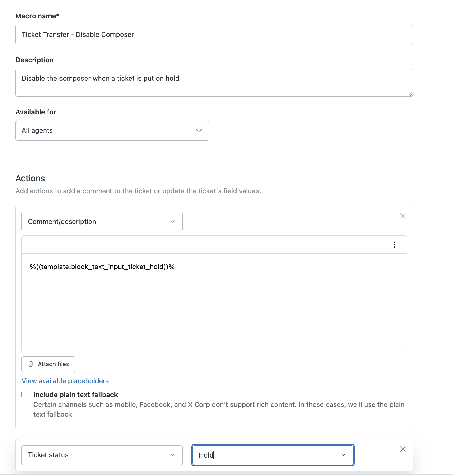 Set up a ticket trigger in Zendesk that sends the template message when a ticket’s status is changed to "on hold." Use the following template syntax: