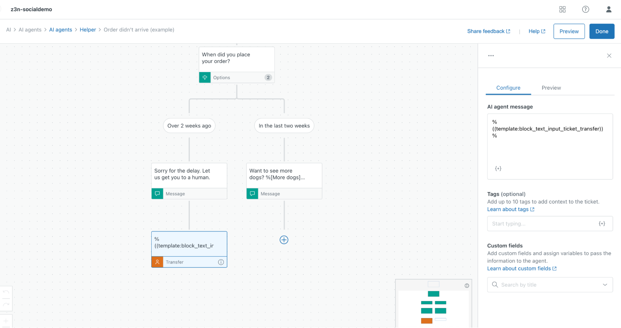 When configuring the AI agent’s escalation logic, update the escalation reply to use this template. Reference the template using the following syntax: