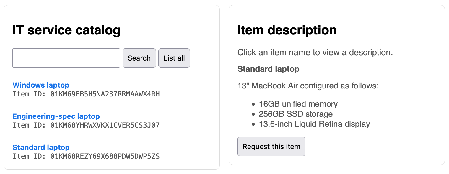 The service catalog is hosted on a Zendesk help center by default. This tutorial shows you how to create a custom service catalog that can be hosted on a different website. A custom implementation is useful if you want to host your catalog on an internal website like your internal IT site.