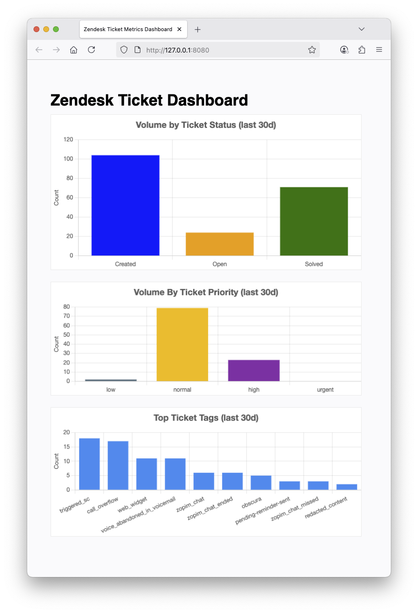 <!DOCTYPE html><html lang="en"><head><meta charset="UTF-8" /><title>Zendesk Ticket Metrics Dashboard</title><script src="https://cdn.jsdelivr.net/npm/chart.js"></script><linkrel="stylesheet"href="{{ url_for('static', filename='styles.css') }}"/></head><body><h1>Zendesk Ticket Dashboard</h1><!-- dashboard has three charts: status, priority, tags --><div id="dashboard"><canvas id="ticket_status_chart" width="600" height="300"></canvas><canvas id="ticket_priority_chart" width="600" height="220"></canvas><canvas id="tags_chart" width="600" height="250"></canvas></div><script src="{{ url_for('static', filename='script.js') }}"></script></body></html>