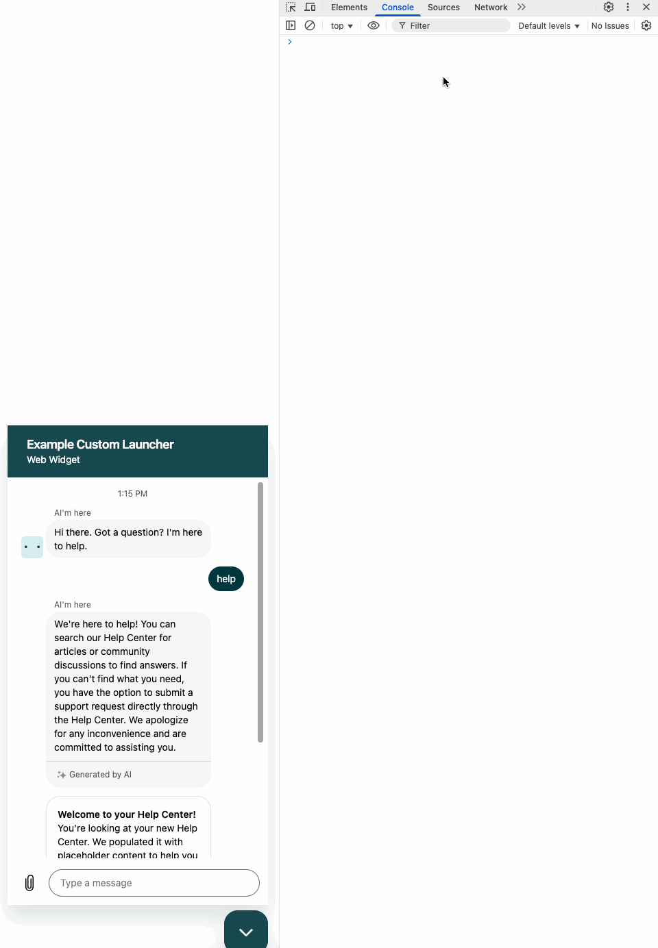color-picker.htmlfile and copy the following contents into it:<!DOCTYPE html><html lang="en"><head><meta charset="UTF-8"><title>Zendesk Messaging Web Widget Demo</title></head><body><h2>Zendesk Messaging Widget</h2><p>This page loads the Zendesk Messaging Web Widget in the lower right corner.</p><!-- Paste your widget snippet with your key below --></body></html> -
